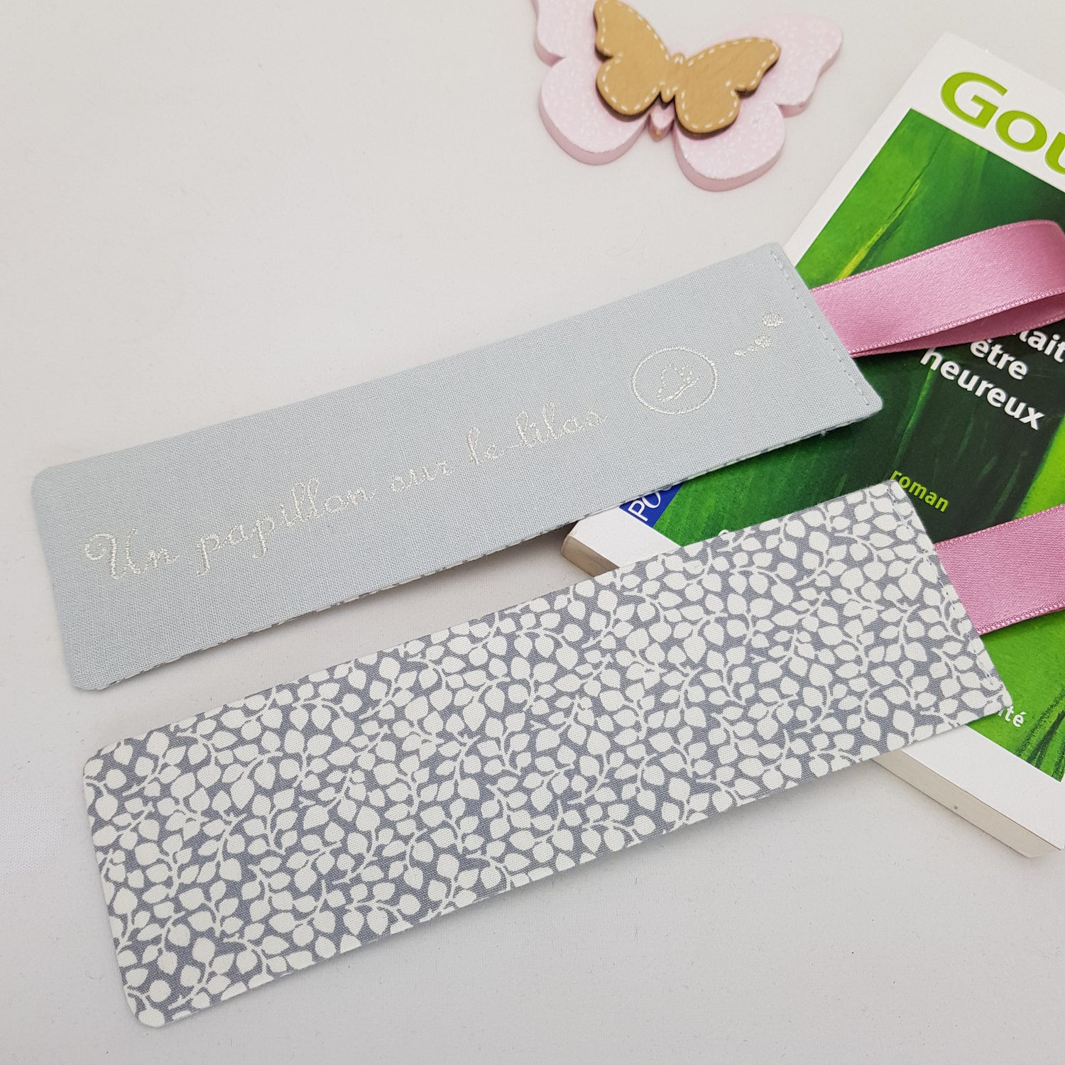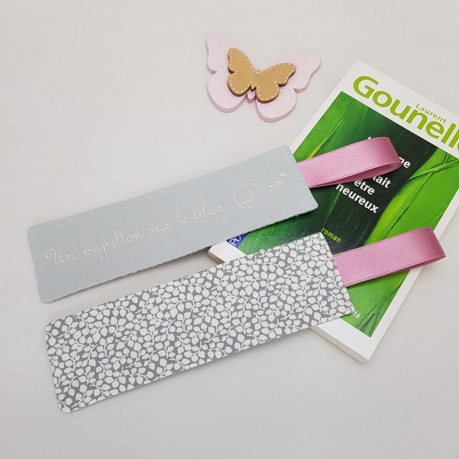 "un papillon sur le lilas" est brodé sur l'un des côtés et un ruban de satin vient agrémenté le marque-page.